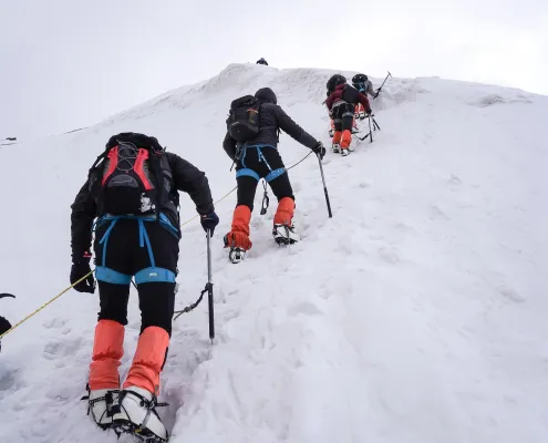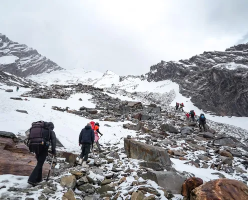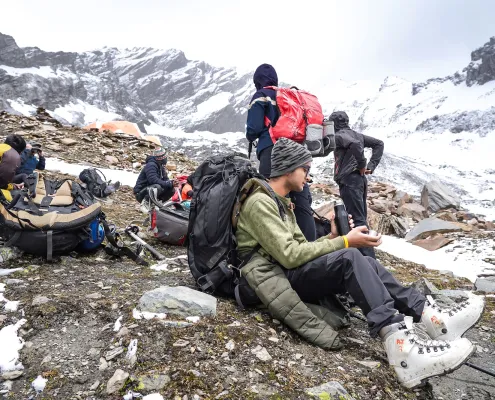 This day is dedicated to acclimatization and preparation for the summit attempt. After breakfast, we carry essential supplies and equipment toward the summit camp, ferrying loads to higher altitude. This activity helps in acclimatization and prepares the route for the upcoming move. After depositing supplies, we descend back to Lady Leg. The rest of the day is spent resting, hydrating, and attending technical briefings as required. Overnight stay in tents at Lady Leg.