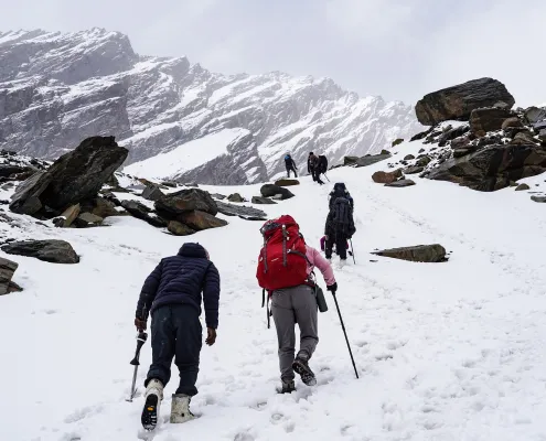 Today’s trek takes us higher into the alpine zone as we ascend from Bakarthach to Lady Leg. The landscape becomes more rugged, with moraines, rocky stretches, and expansive views of Friendship Peak and nearby ridges. The steady climb allows the body to adapt to the increasing altitude. The trek takes around 4 to 5 hours. After arriving at Lady Leg, we establish camp and spend the remainder of the day resting and hydrating. Overnight stay in tents at Lady Leg.