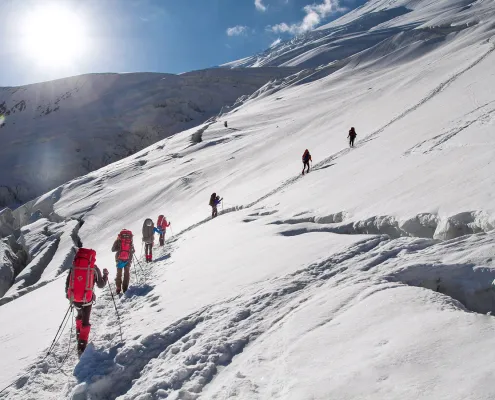 The expedition covers high-altitude trekking, glacier travel, steep snow and ice slopes, and final summit ridge sections. While the climb is not technically difficult like advanced rock routes, it involves steep, sustained snow/ice sections where crampons and ice axes are essential. Fixed ropes are used in certain steep segments during the main climbing season.