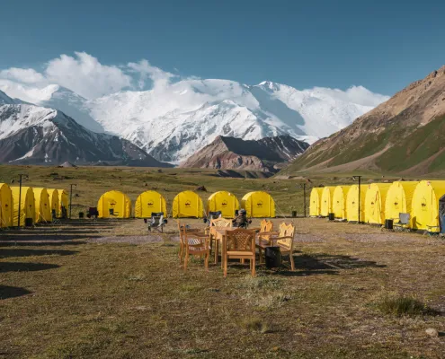 After breakfast, we begin a scenic 5–6 hour drive from Osh to the Achik Tash Base Camp, passing through the expansive Alay Valley with stunning views of the Trans-Alay Range. The dramatic mountain scenery provides the first glimpse of the expedition environment. Upon arrival at Base Camp, we settle into our tents, familiarize ourselves with camp facilities, and rest. Overnight stay at Base Camp.