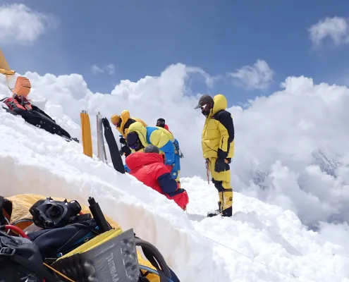 • Set up gear and organize climbing equipment for the upcoming ascent.
