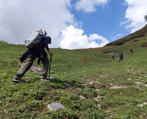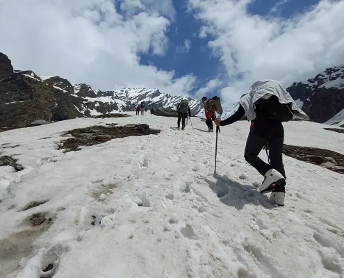 Begin your trek towards Bakarthach, walking through alpine meadows and gradually ascending along the Beas River valley. Surrounded by snow-clad peaks and vast open landscapes, this stretch offers stunning Himalayan views.