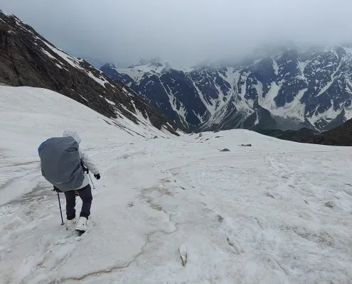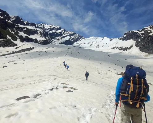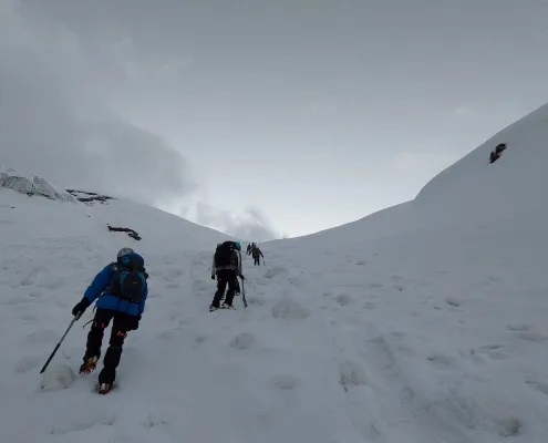 The journey unfolds through changing landscapes — from green valleys and alpine meadows to stark, wind-swept ridges and snow-covered slopes. As altitude increases, the environment becomes harsher and more demanding. Nights are colder, oxygen levels drop, and each day requires careful pacing and recovery. Summit day is a steady, sustained push on snow and mixed terrain, where fitness and mental discipline matter more than speed.