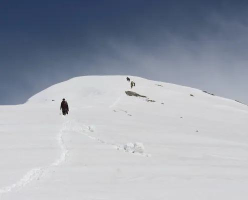 The Patalsu Peak Winter Training Expedition transforms a familiar mountain into a serious snow and cold-weather classroom. At around 4,200 m, Patalsu becomes an intense environment for learning winter skills — snow movement, cold management, and endurance.
