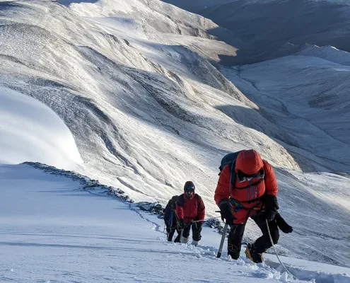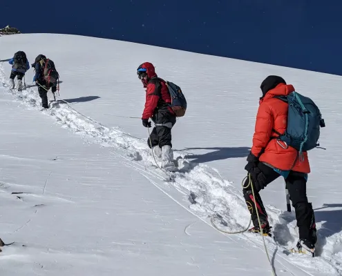 Although the trail to the top of UT Kangri is beautiful, it is also challenging and requires prior experience in high-altitude trekking. The summit day is the longest and most exhausting day of the expedition, lasting around 10-11 hours. Climbers will be roped up in a team and will need to climb steep slopes in deep snow conditions. However, reaching the top of UT Kangri is rewarding as it offers breathtaking views of the surrounding Himalayan ranges such as the Karakoram, Zanskar, and Stok ranges that will be etched in the climbers’ memories forever.
